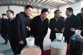 湖北省委常委、宜昌市委書記黃楚平(左三)觀看當陽公司產品。左一為當陽市委書記鄭廷貴,右二為當陽市委副書記、市長張世敏