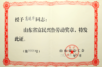近日,公司被山東省總工會授予“富民興魯勞動獎狀”,總裁高進華獲得“富民興魯勞動獎章”。