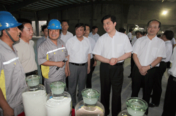 河南省商丘市委書記陶明倫(右二)、市長余學友(右三)觀看寧陵公司生產的產品,左三為寧陵公司總經理王經明