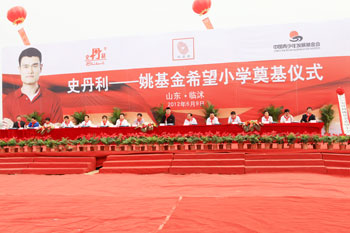 姚基金發(fā)起人姚明、中國青少年發(fā)展基金會秘書長涂猛,共青團(tuán)山東省委黨組成員、紀(jì)檢組長謝寧,山東省青少年發(fā)展基金會秘書長王太麗,臨沂市人大副主任錢迎偉,共青團(tuán)臨沂市委書記羅成建,臨沭縣委書記任慶虎,公司董事長高文班、總經(jīng)理高進(jìn)華出席奠基儀式。??