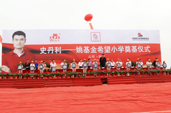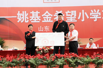 總經(jīng)理高進(jìn)華(左)與姚明向希望小學(xué)授牌