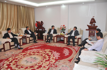 高文班(左二)陪同王道龍(左三)、劉繼芳(左一)座談,左四為縣委書記孫豐剛