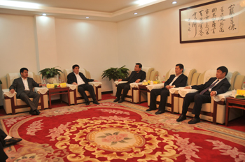 鎮賚縣委書記金喜雙(左一)與董事長高文班(右一)親切交談