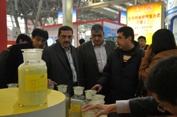 國投新疆羅布泊鉀鹽有限責任公司是公司的重要供應商,該公司副總經理郭興壽一行專門來到公司展位進行參觀。總經理高進華與郭興壽一行進行了親切交談,向客人介紹了純硫基復合肥的生產工藝和產品特點。郭興壽表示,作為硫酸鉀生產企業,希望能與史丹利公司深入合作,繼續為史丹利公司提供優質硫酸鉀,滿足純硫基復合肥的生產需要。