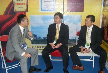 臺灣化肥股份有限公司首席代表黃耀興博士(中)與章金明進行技術與業務研討