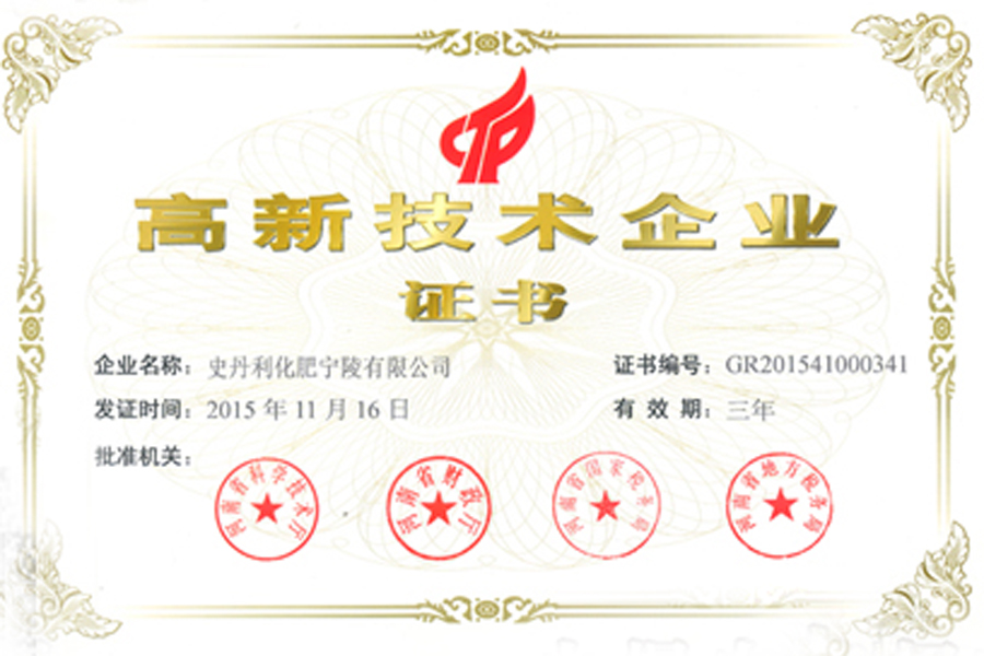 史丹利化肥寧陵公司獲得國家高新技術企業榮譽稱號