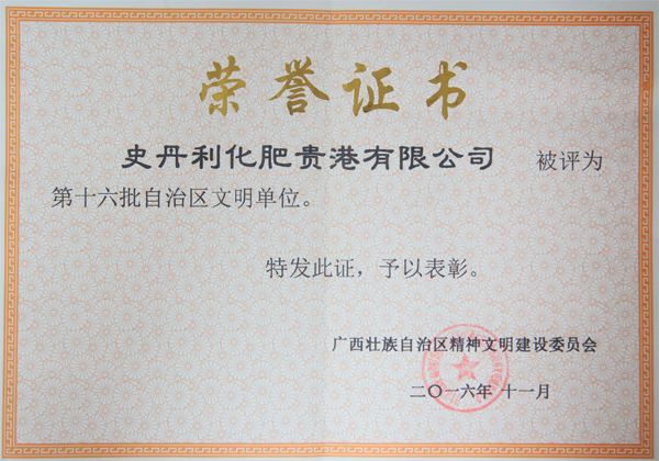 根據廣西壯族自治區精神文明建設委員會《關于表彰第十六批自治區文明村鎮、文明單位、軍(警)民共建精神文明先進單位的決定》(桂文明委〔2016〕6號)通知,史丹利化肥貴港公司榮獲第十六批自治區“文明單位”稱號。