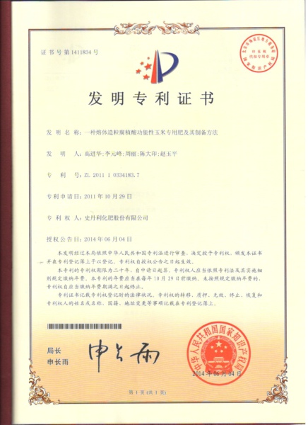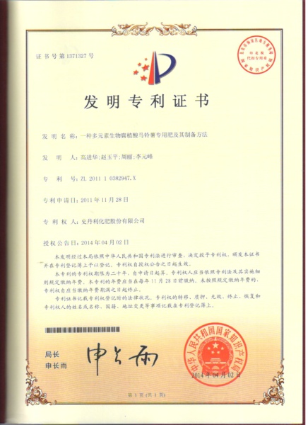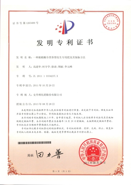 公司《一種熔體造粒腐植酸功能性專用肥及其生產方法(ZL201110334215.3)》、《一種多元素生物腐植酸馬鈴薯專用肥及其制備方法(ZL201110382947.x)》、《一種熔體造粒腐植酸功能性玉米專用肥及其制備方法(ZL201110334183.7)》、《一種腐植酸全營養型花生專用肥及其制備方法(ZL201110334237.x)》等4項腐植酸類作物專用肥專利獲得國家知識產權局的授權。