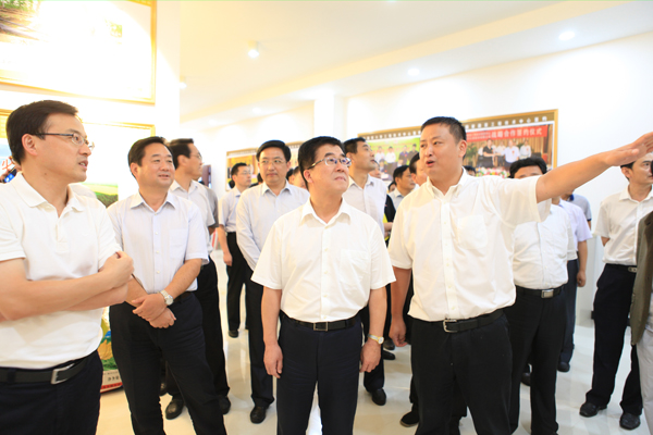 臨沂市市委副書記李峰(右二),臨沭縣縣委書記、縣人大常委會主任任慶虎(左一)、總裁高進華(右一)參觀示范園展廳